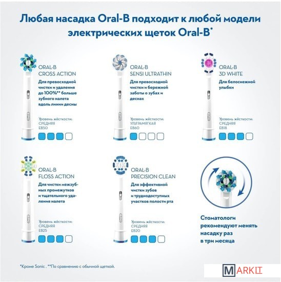 | Совместимые модели | Подходит ко всем электрическим зубным щеткам Oral-B, кроме звуковых электрических зубных щеток Oral-B Sonic/Pulsonic. / Подходит ко всем электрическим зубным щеткам Oral-B, кроме звуковых электрических зубных щеток Oral-B Sonic/Pulsonic, а также Oral-B iO Series. |